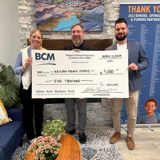 BCM Insurance Company is committed to supporting organizations and events that align with its mission and values, and positively impact the Niagara Region. The Kristen French Child Advocacy Centre is honoured to be chosen year after year as a recipient. Their involvement helps up to make a difference in lives of Niagara’s children and youth.